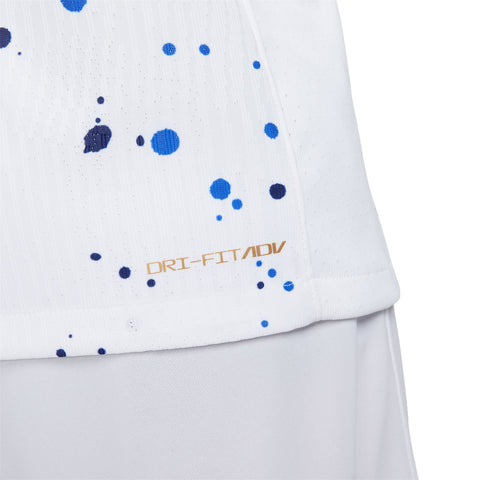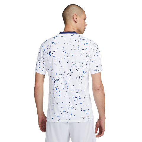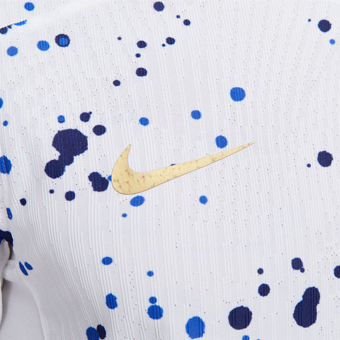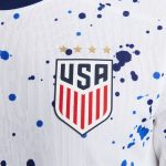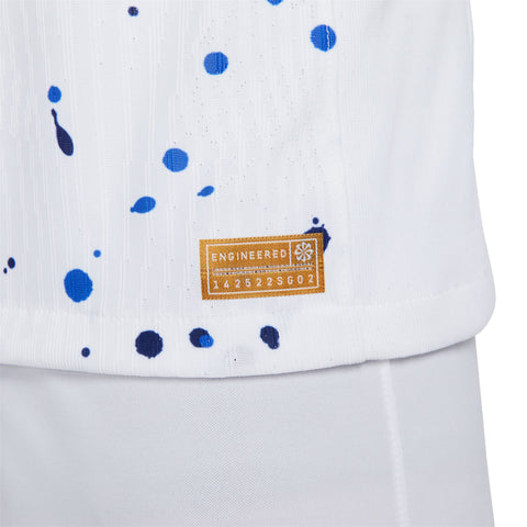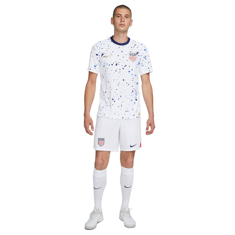 • Like a piece of abstract art, the design of the USWNT 2023 Home jersey is more than meets the eye. Its paint-splatter graphic allows each jersey pattern to be unique, celebrating the individuals who, together, create order among the chaos of the game. Gold accents throughout pair with hidden details to commemorate the team’s unrivaled 4 world championships. Our Match collection pairs authentic design details with lightweight, quick-drying technology to help keep the world’s biggest soccer stars cool and comfortable on the field.